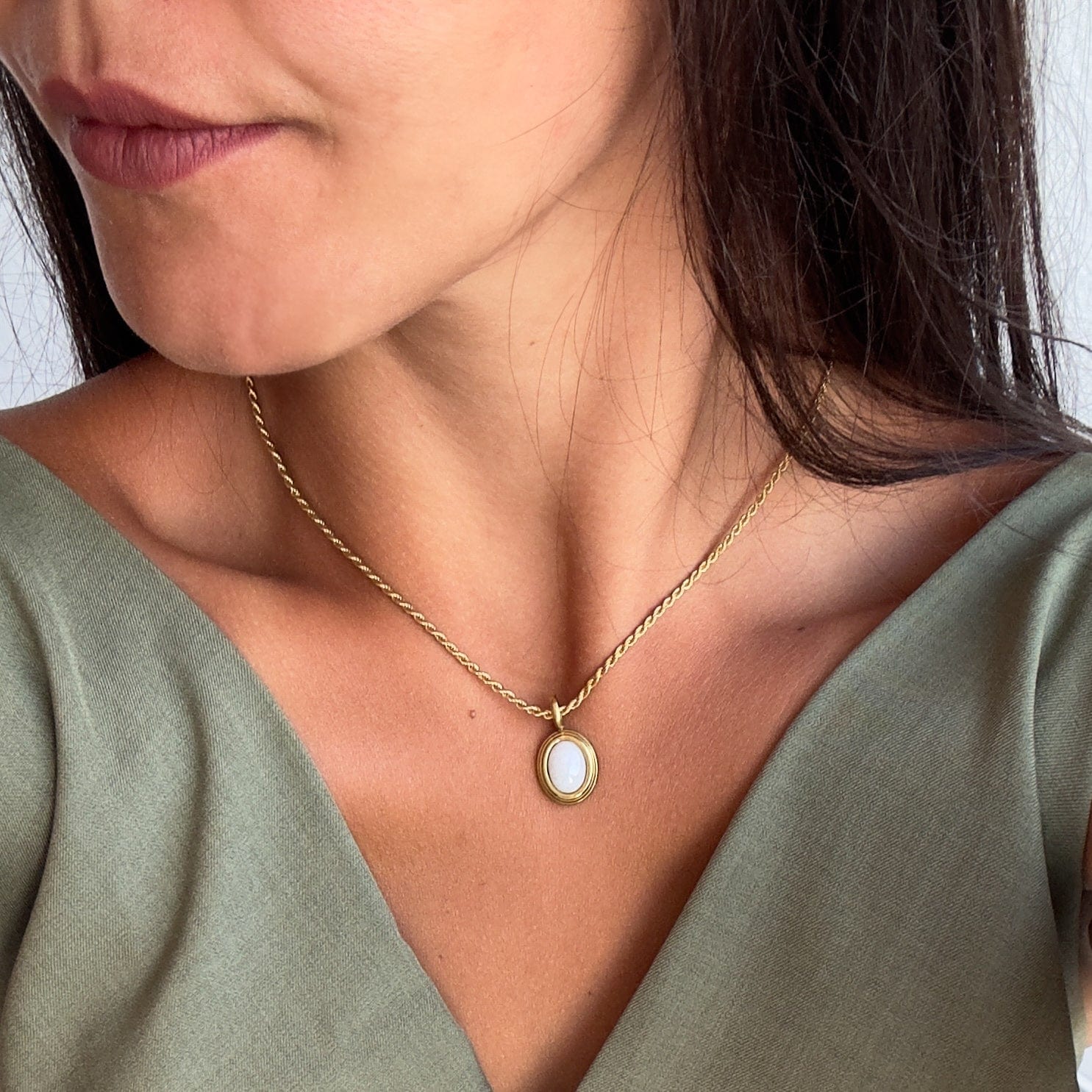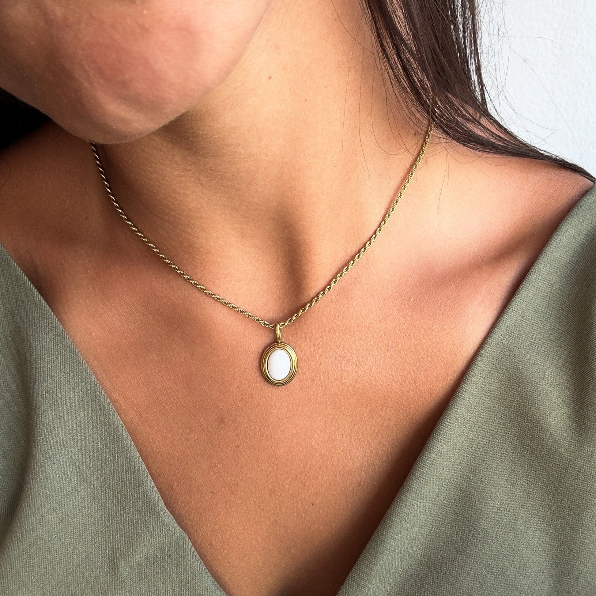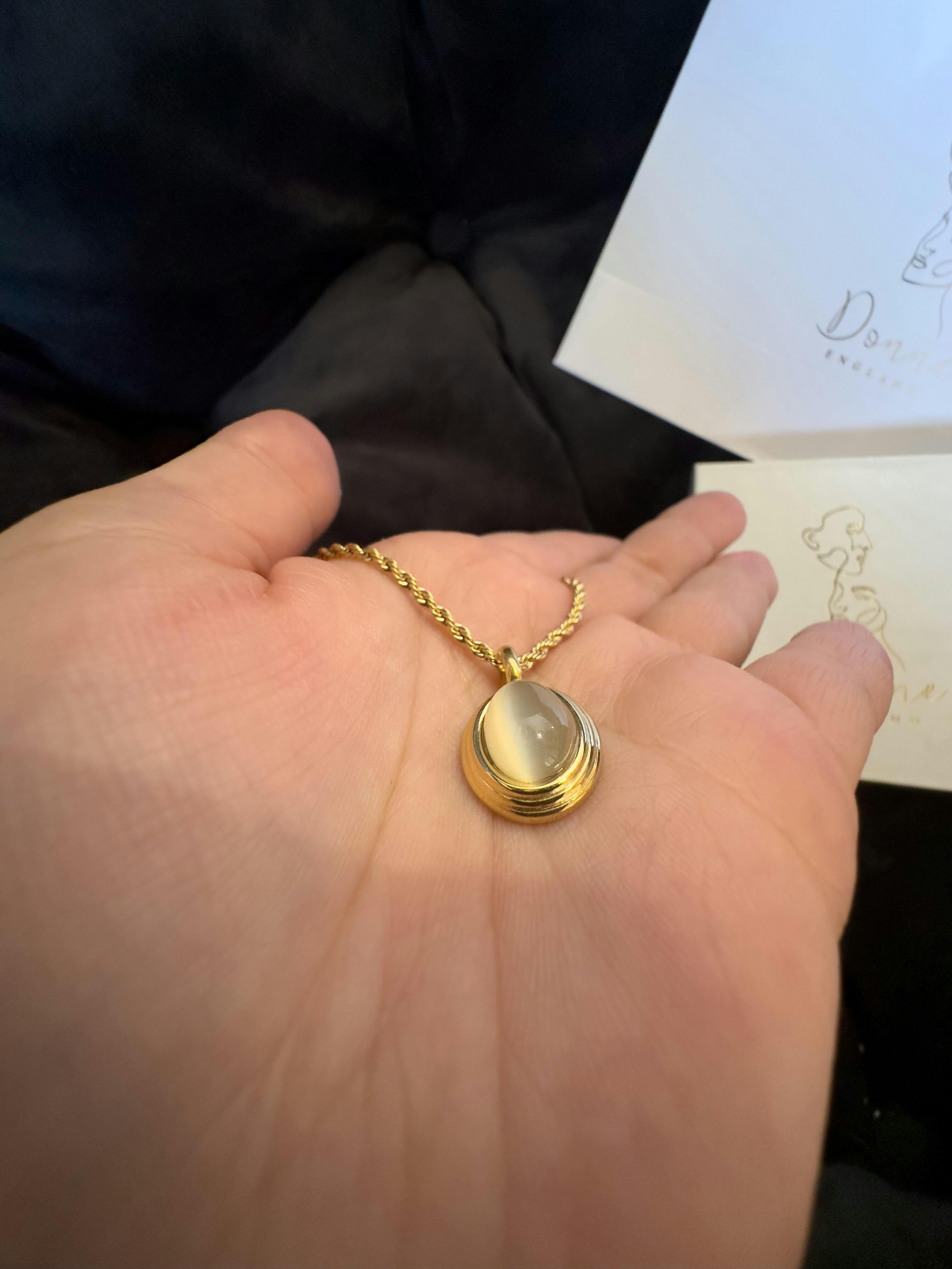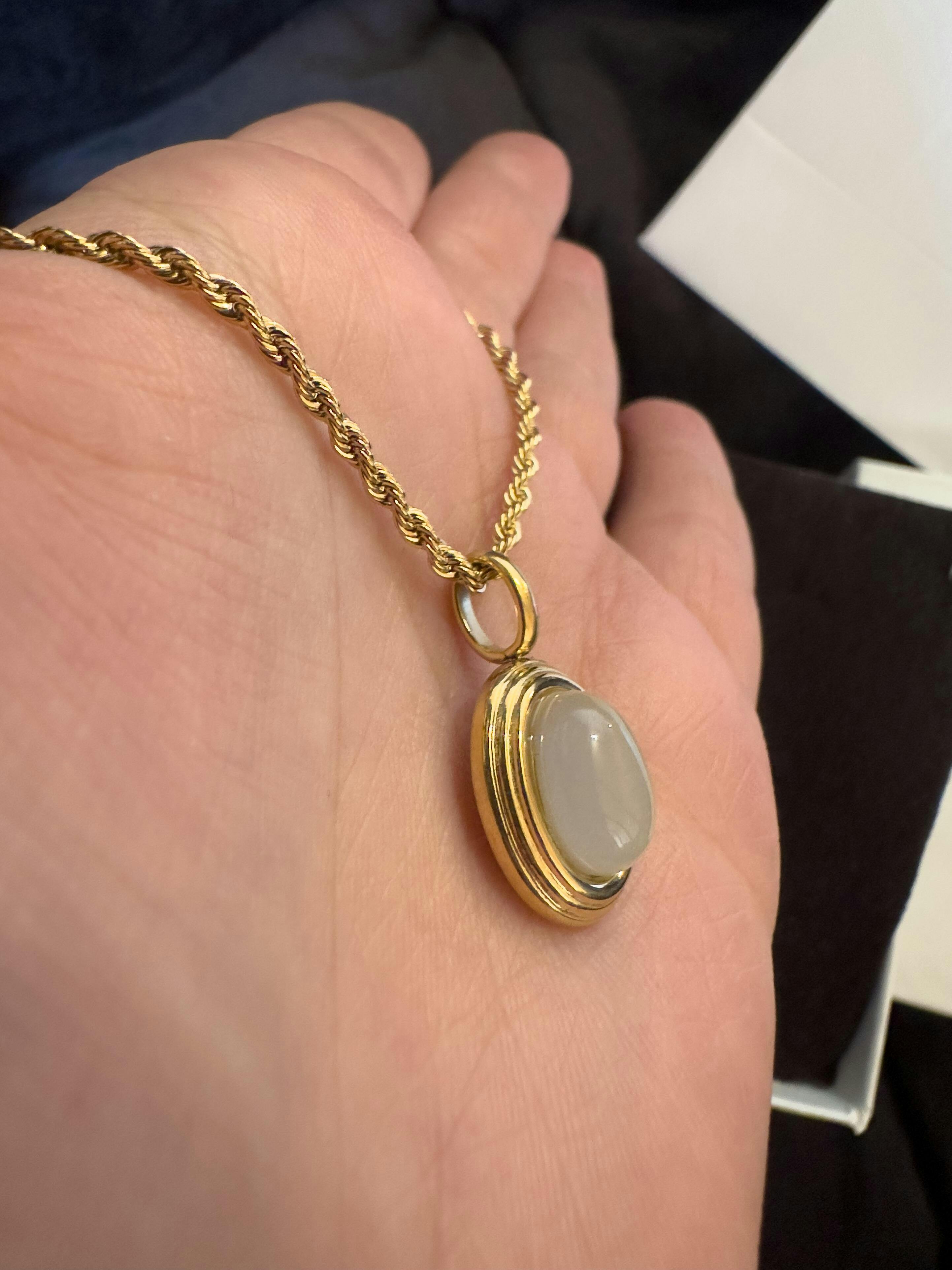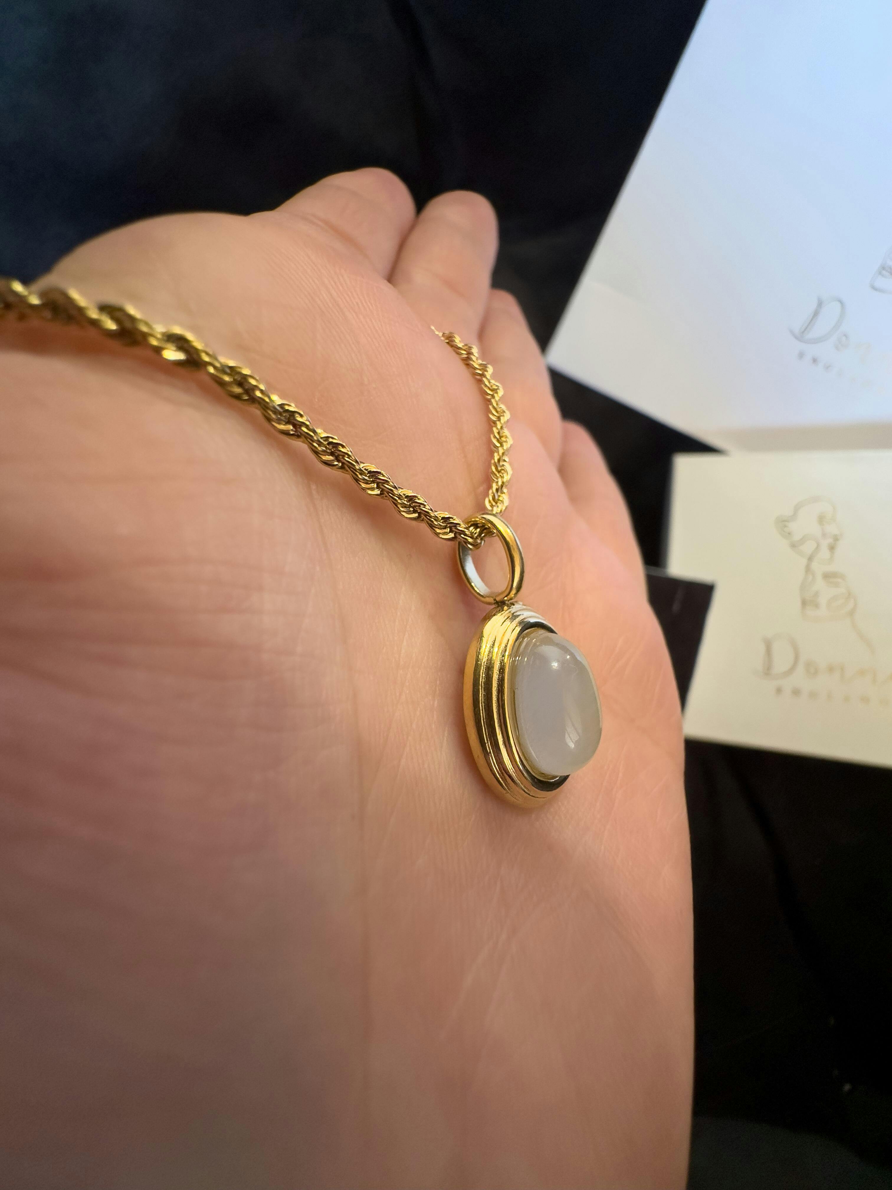 Moram da vas javno pohvalim, ova ogrlica je sve što svakoj elegantnoj dami treba! ❤️ Istančana, izvajana u sitne detalje, reljefna, sofisticirana, izgleda jako luksuzno i skupo. Slikala sam je u tamnom prostoru, pa je kamen malo tamniji inače na svetlu bude čistobeo. Boja varira u zavisnosti od svetlosti prostorije odnosno- kamen reflektuje svatlost. 😍 Uzecu sigurno i ovakvu sa crnim kamenom. 👌